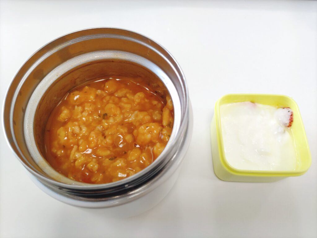 オススメは無糖ヨーグルトにフルーツソースを少しかけます。かなりもったりと重量感もあり、とても美味しいです。小さなタッパーに入れるのですが、かなりの満足感を得られます。