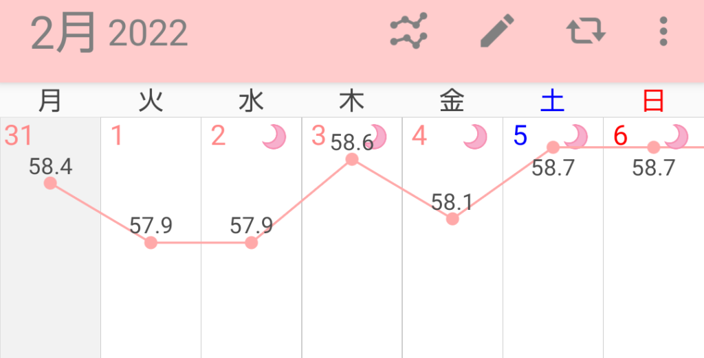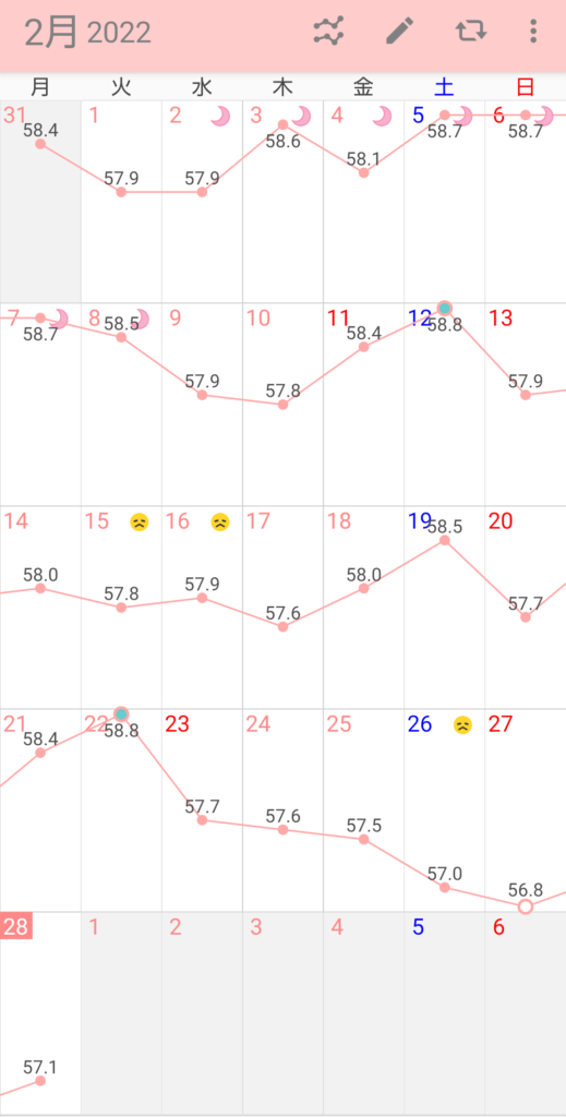 1月は57kg台は1日だけでしたが、2月は月の半分以上を57kg台で経過できました。ただし、体調が安定しなかったことが原因の一つとも考えられます。健康的に痩せるためには、心身の不調がない状態で筋肉をつけながら脂肪を落とすように体重を減らしていく必要があります。