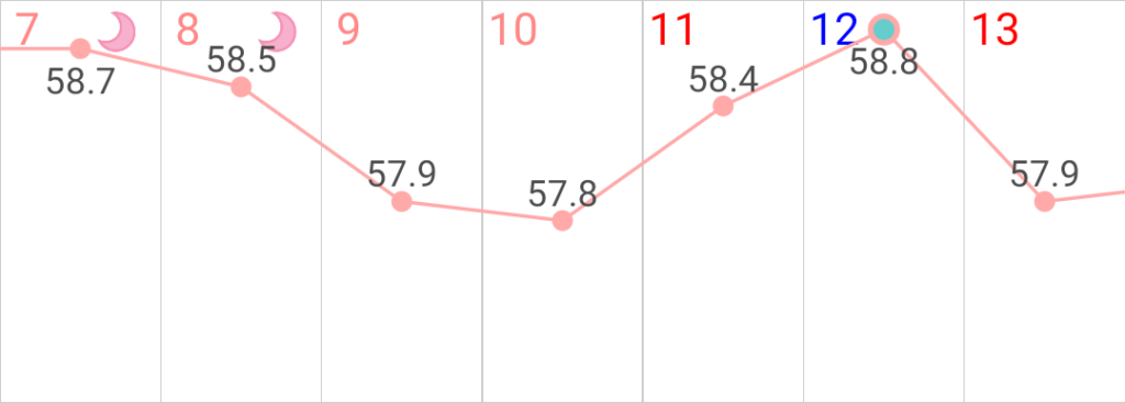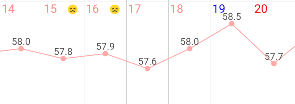 それでも食欲はあり、さらに月経による食欲増進によって58kg台後半で翌週へ突入します。