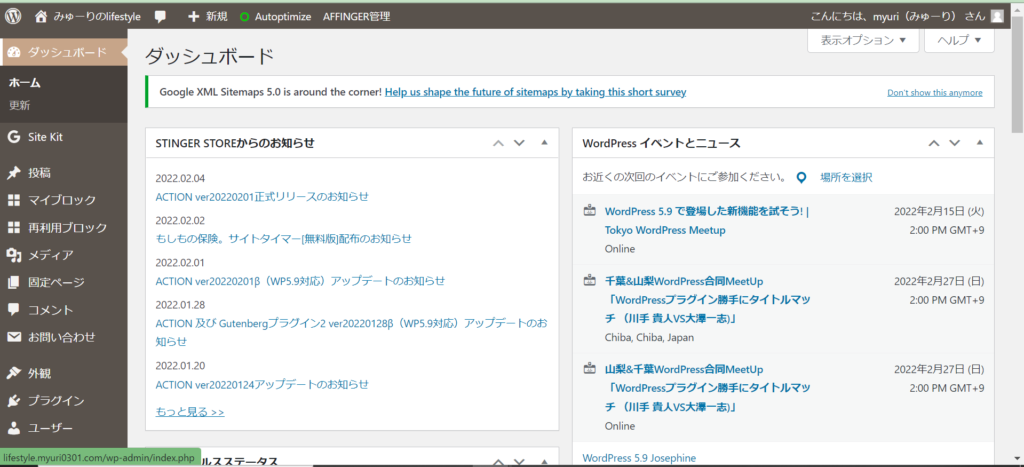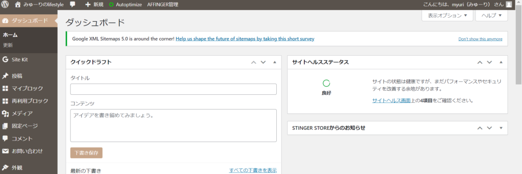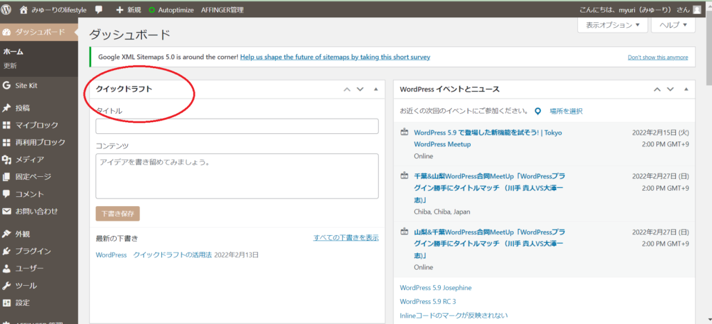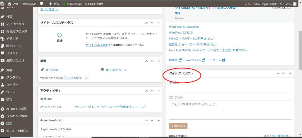 私が現在使用しているテーマはアフィンガー6です。ダッシュボードを開いたときの画面がこちらです。パッと見たときにクイックドラフトが見当たりません。
