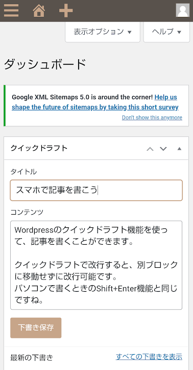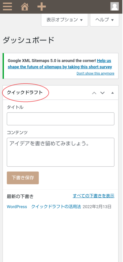 クイックドラフトとはその名の通り、早く下書きができる機能です。思いついた記事ネタをどんどんメモしていくことができます。タイトルとコンテンツのどちらかだけでも下書き保存が可能です。